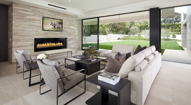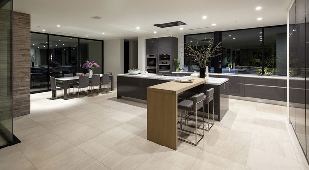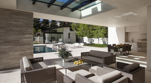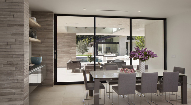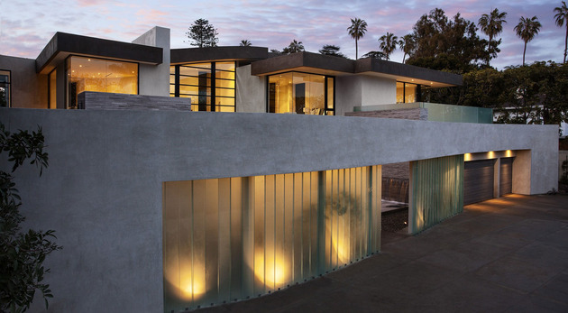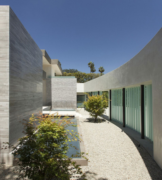 房子位于一條街道,為了減少汽車噪音影響,建筑師用高大的圍墻和大門將庭院與街道隔開,大門兩側是玻璃百葉,起到緩沖噪音的作用,同時不阻擋光線通過。此外,還設計了一條路和小橋,將大門和室內連接。穿過院子時,可以欣賞水景,也能聽到瀑布墻的流水聲,使人感到非常放松。